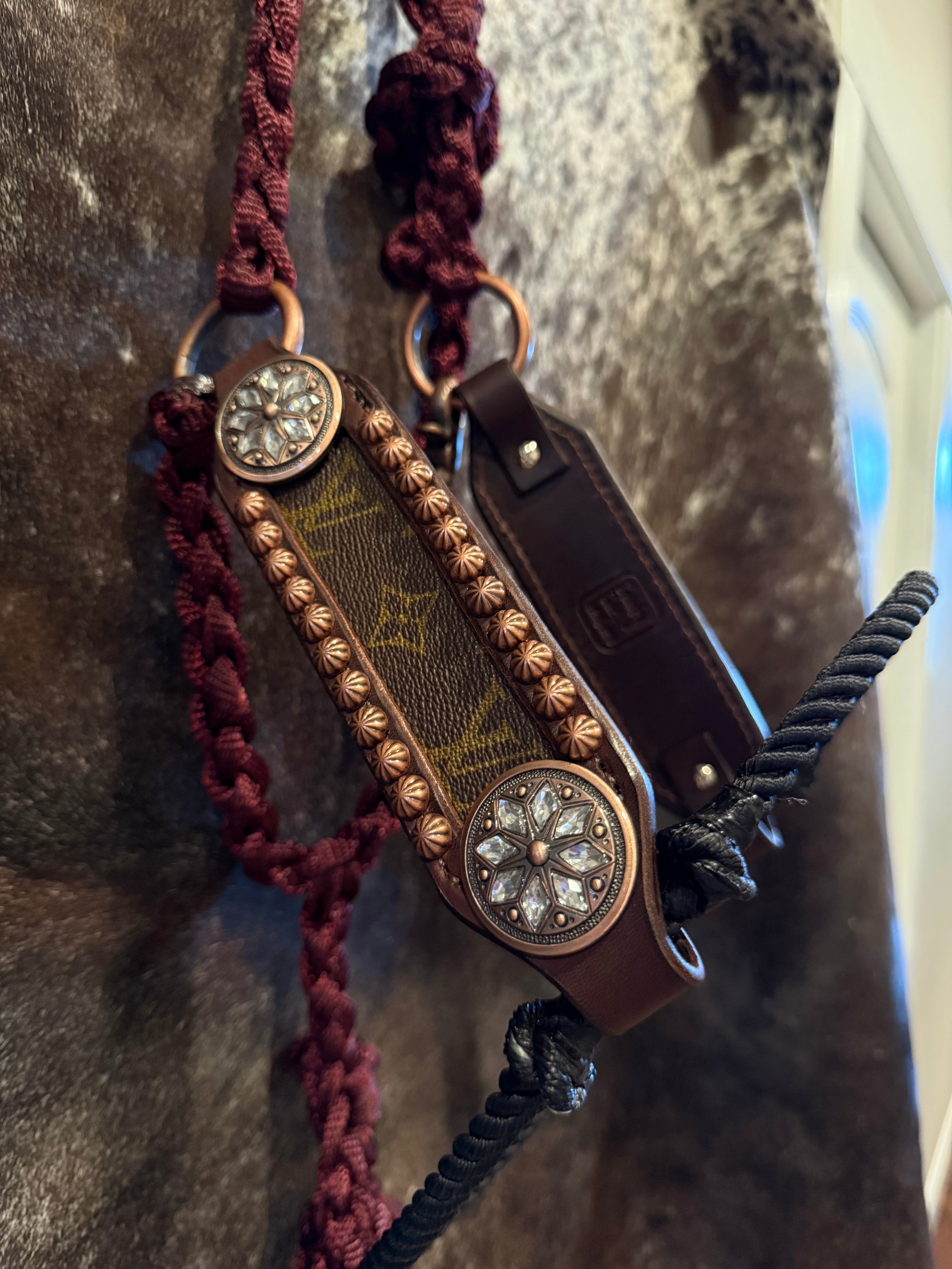 Custom muletape lariat Noseband halter with authentic refurbished Louis Vuitton and cowhide leather.